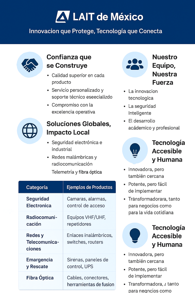 Desde 2020, en LAIT de México nos hemos consolidado como referentes en la distribución de soluciones de seguridad electrónica, telecomunicaciones y tecnología avanzada. Nuestra misión es clara: ofrecer productos que no solo resuelvan necesidades técnicas, sino que también generen valor humano y comercial.