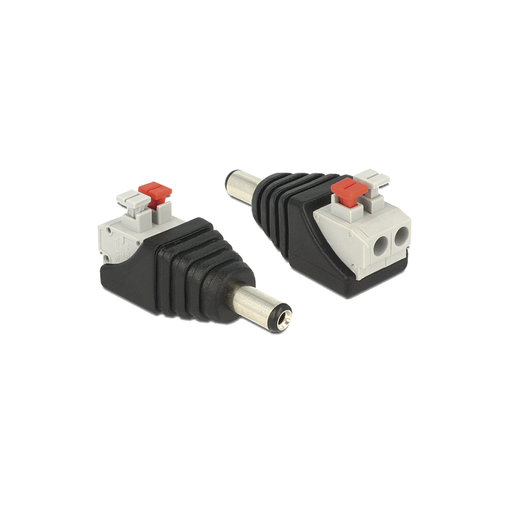 - Un extremo es un conector de barril de CC macho estándar y el otro extremo es un bloque de terminales tipo push de dos posiciones