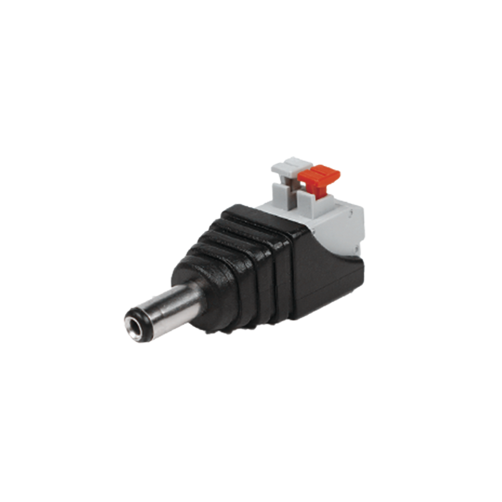 Adaptador tipo jack de 3.5 mm macho polarizado de 12 Vcc con terminales tipo push.