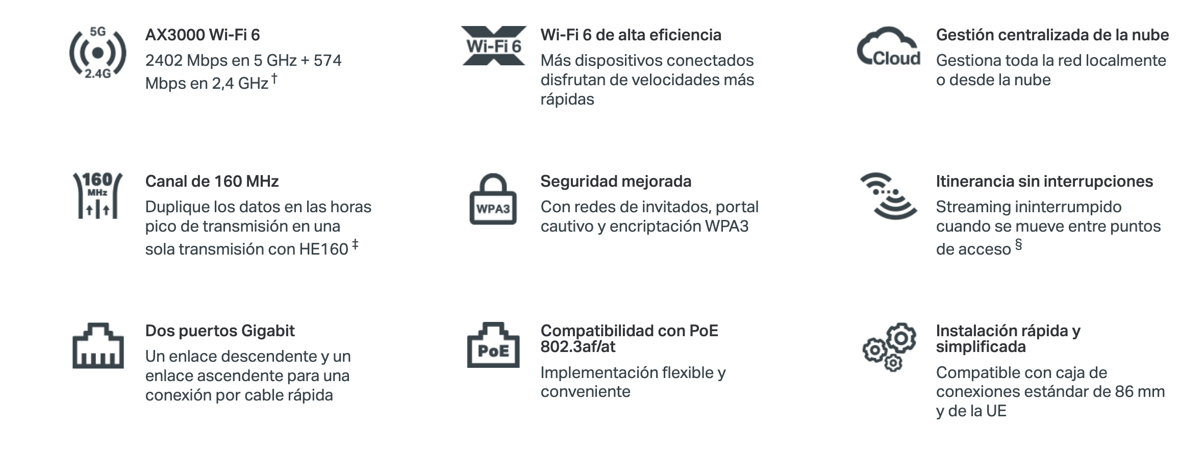 Punto de Acceso Omada / Wi-Fi 6 AX3000 MU-MIMO 2×2 / Alta Densidad de Usuarios / Configuración por Controlador o Stand-Alone / Para Montaje en Techo/pared / Alimentación PoE+