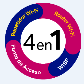 - Modos de operación: Punto de Acceso, Enrutador, Repetidor y WISP