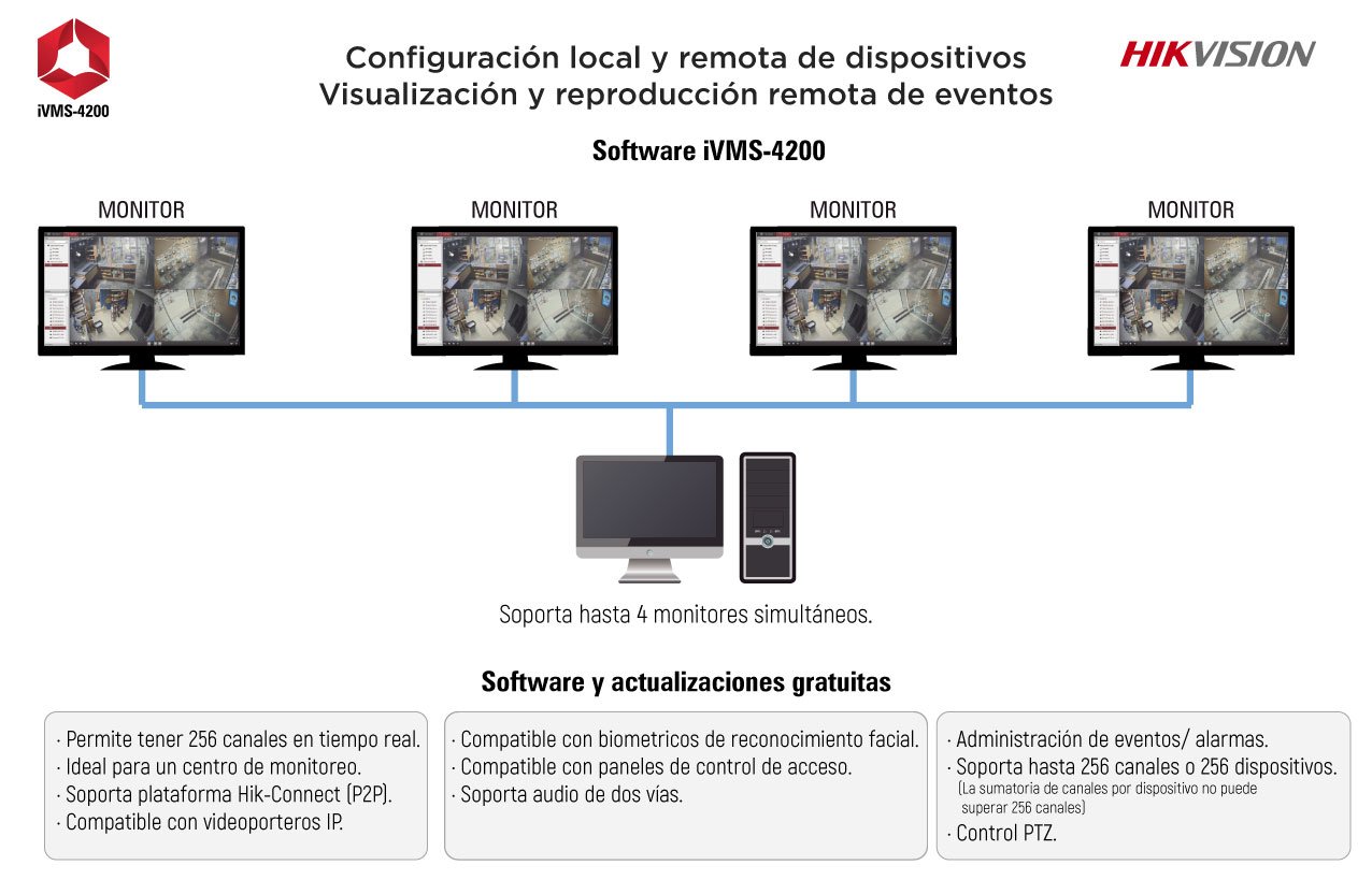 iVMS-4200 es un software de gestión de video que utiliza una estructura distribuida para ofrecer gestión centralizada a todos los dispositivos conectables. Permite gestionar el NVR, DVR, cámaras IP y decodificadores. Con distintos módulos de gestión y configuración y una combinación razonable, ofrece múltiples soluciones para distintos casos de vigilancia a pequeña o media escala.